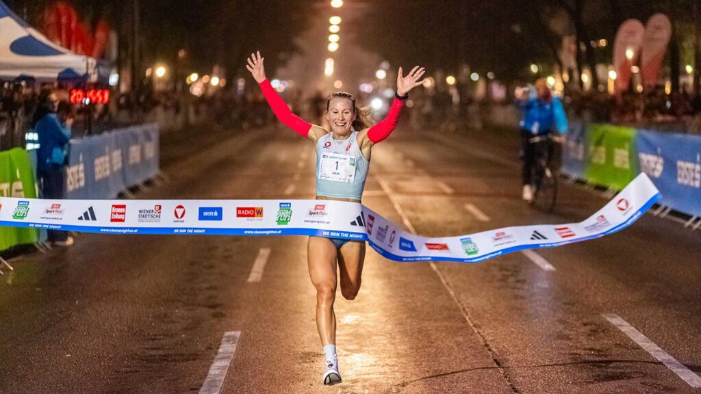 Julia Mayer beim Vienna Night Run: Julia Mayer läuft als Siegerin durch das Ziel beim Vienna Night Run – ihr Lächeln verrät: Regeneration, Energie und Fokus sind kein Zufall. Rohkakao gehört für sie längst zu den kleinen Routinen, die Großes bewirken.
